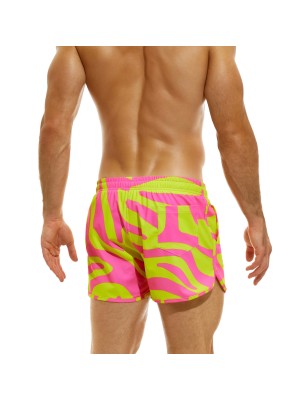 Motif tigré jaune et rose sur l'ensemble du bermuda de bain.