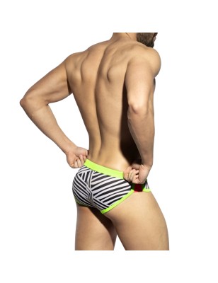 Slip de bain à rayures Uganda de couleurs blanc rosé, noir, vert et rose fluo.